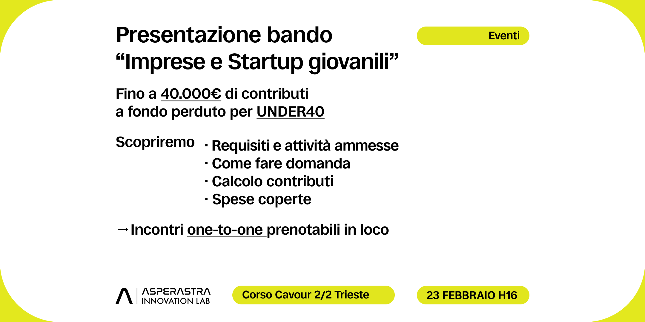 Asperastra Innovation Lab Corso Camillo Benso Conte di Cavour 2/2, Trieste, TS, ItalyVuoi avviare un’attività in Friuli Venezia Giulia e hai meno di 40 anni? La Regione FVG ha attivato un bando che prevede contributi a fondo perduto fino a 40.000 euro ... Leggi l'articolo completo